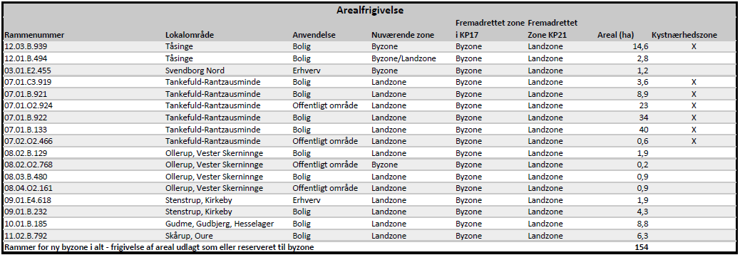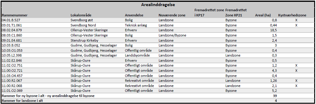 På nedenstående skema fremgår den aktuelle restrummelighed, der viser hvor der er uudnyttede kommuneplanrammer til boligformål i de forskellige lokalområder.