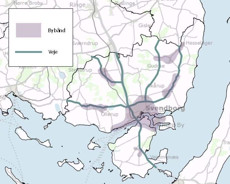 Bystrukturen i Svendborg Kommune er karakteriseret ved en række "bybånd" langs vejene mellem de gamle købstæder på Fyn.