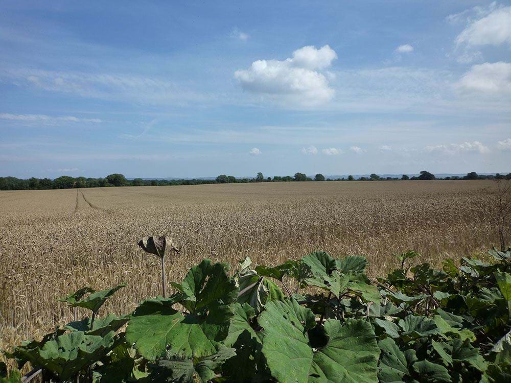 Udsigt over det jævnt skrånende landskab syd for Vejstrup Ådal til Langelandsbæltet. Vejstrup Ådal markeres af trætoppene der stikker op over dalstrøget overkant og derved ligger som en grøn ”slange” i landskabet.