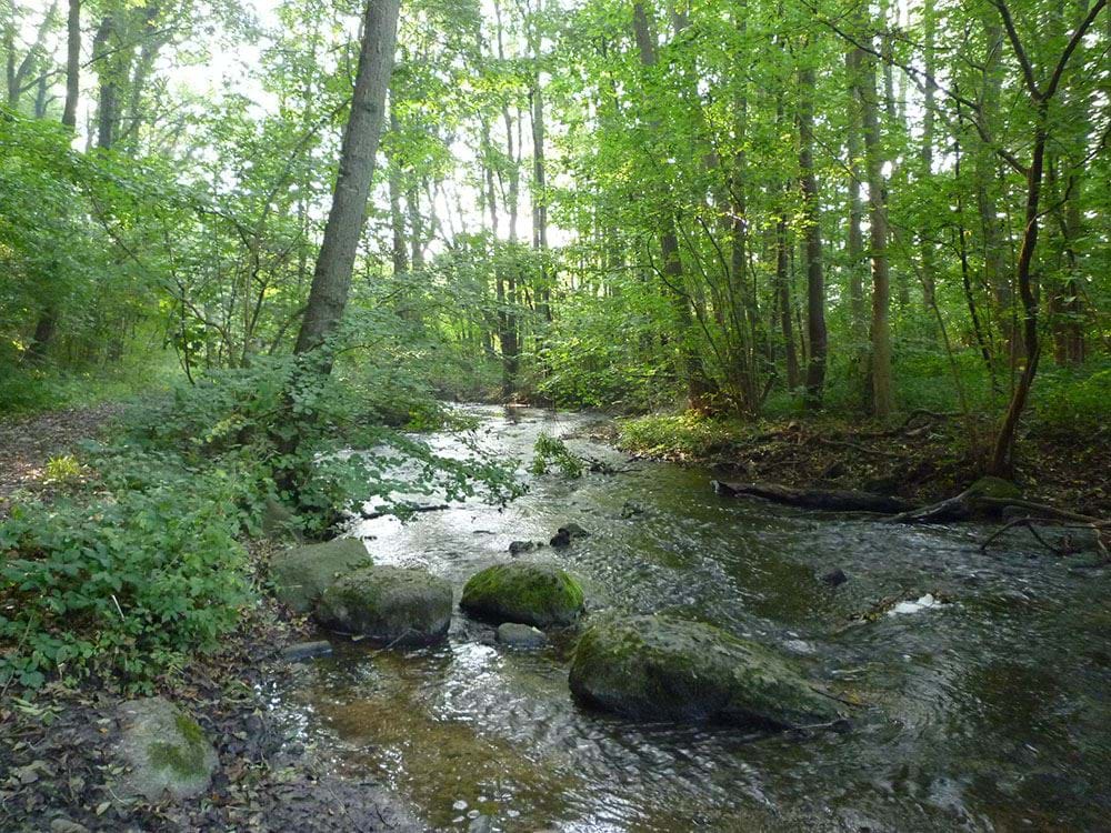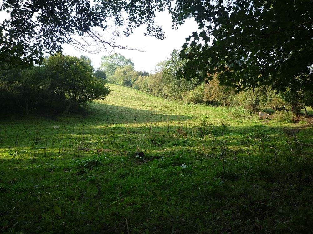 Åbne græssede arealer på dalsiderne og i dalbunden bryder ådalens lukkede bevoksning.