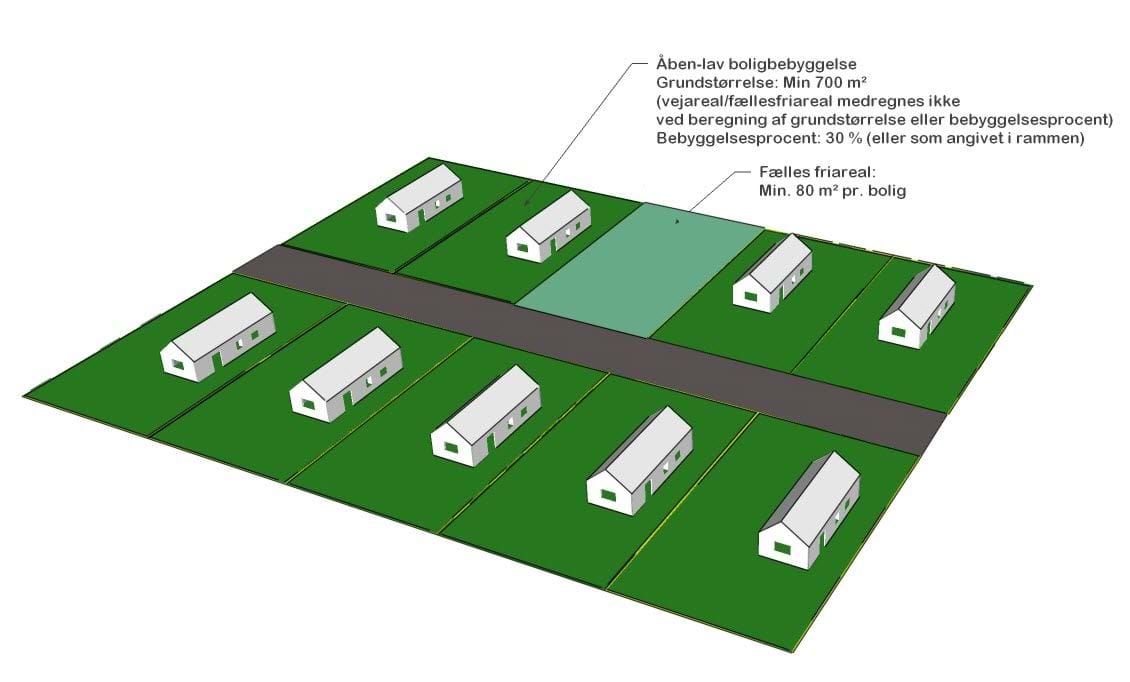Ved lokalplanlægning skal der stilles krav om, at området overvejende skal være i form af fritliggende énbolighuse udført som åben-lav boligbebyggelse. Det betyder, at mindre dele af området ved lokalplanlægningen kan fravige dette krav, fx ved planlægning for tofamiliehuse, dobbelthuse og tæt-lav boligbebyggelse.