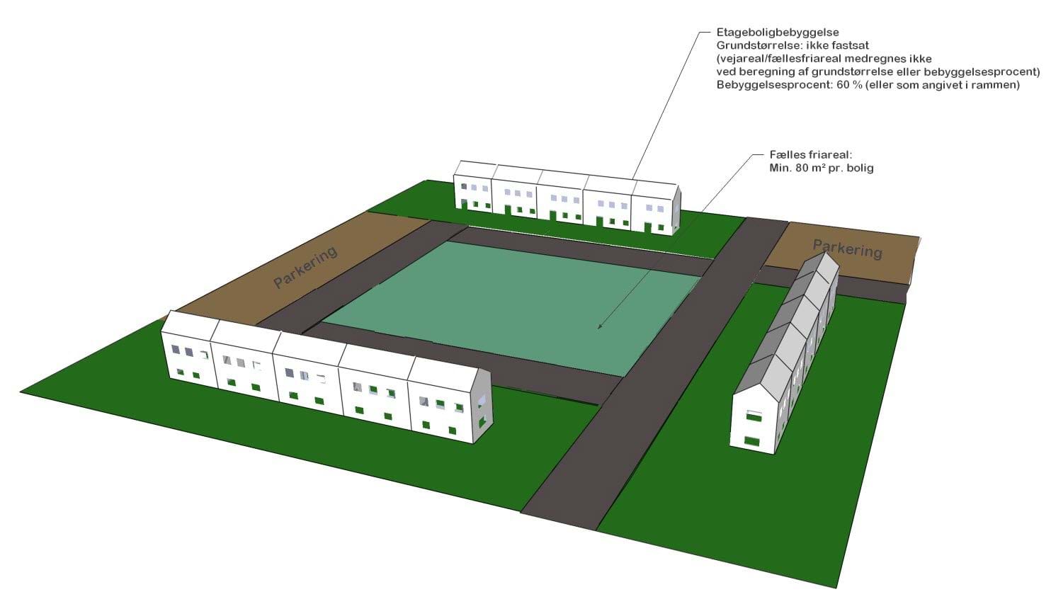 Områder udlagt til boligformål i form af overvejende fritliggende énbolighuse skal fremstå som værende hovedsageligt bestående af fritliggende énbolighuse opført som åben-lav bebyggelse, mens mindre dele af området eller enkelte ejendomme kan fraviger herfra. Dog kan der ikke tilladeles opførsel af etageejendomme indenfor disse rammer.