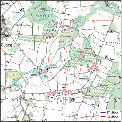 Der udlægges derfor en støjkonsekvenszone omkring vindmøllerne som det fremgår af nedenstående støjkonsekvenskort.