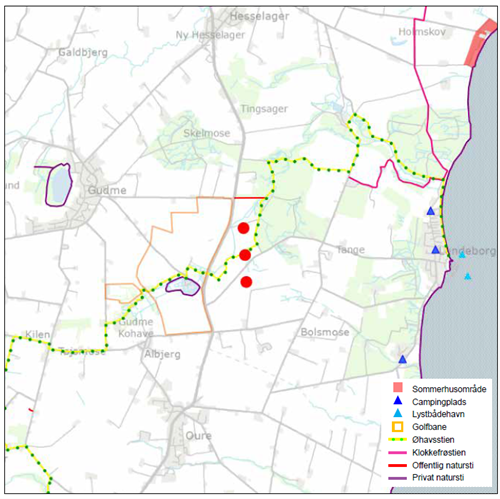 Golfbaner betragtes sædvanligvis ikke som støjfølsom arealanvendelse, og opstillingen af vindmøllerne vurderes derfor ikke at forhindre en eventuel etablering af de planlagte golfbaner eller at være i konflikt med de rekreative interesser i denne forbindelse.