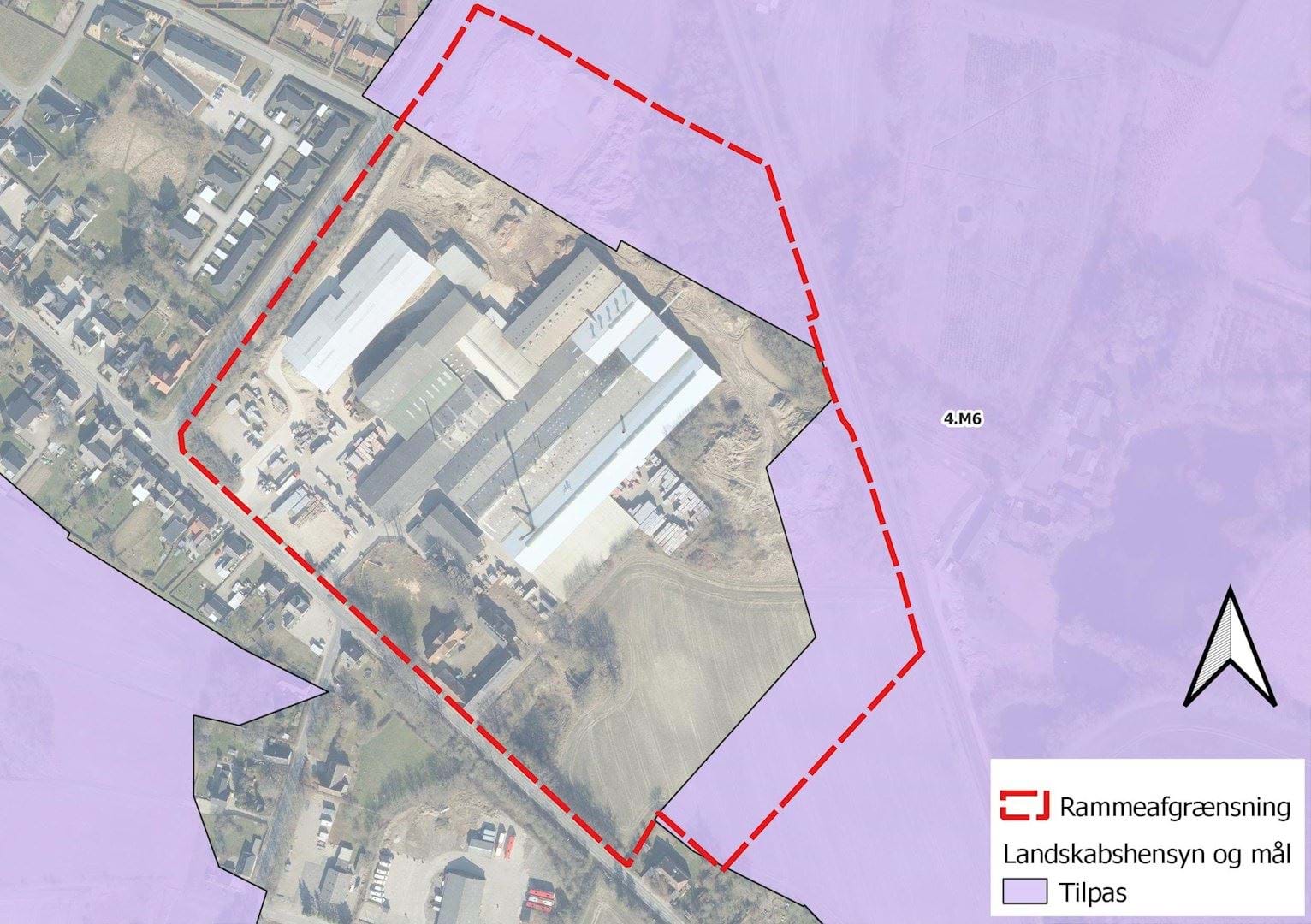 Kortudsnit der viser områdeafgrænsningen af landskabsområdet 4.M6, ramme- og lokalplanafgrænsningen samt byggefelterne.