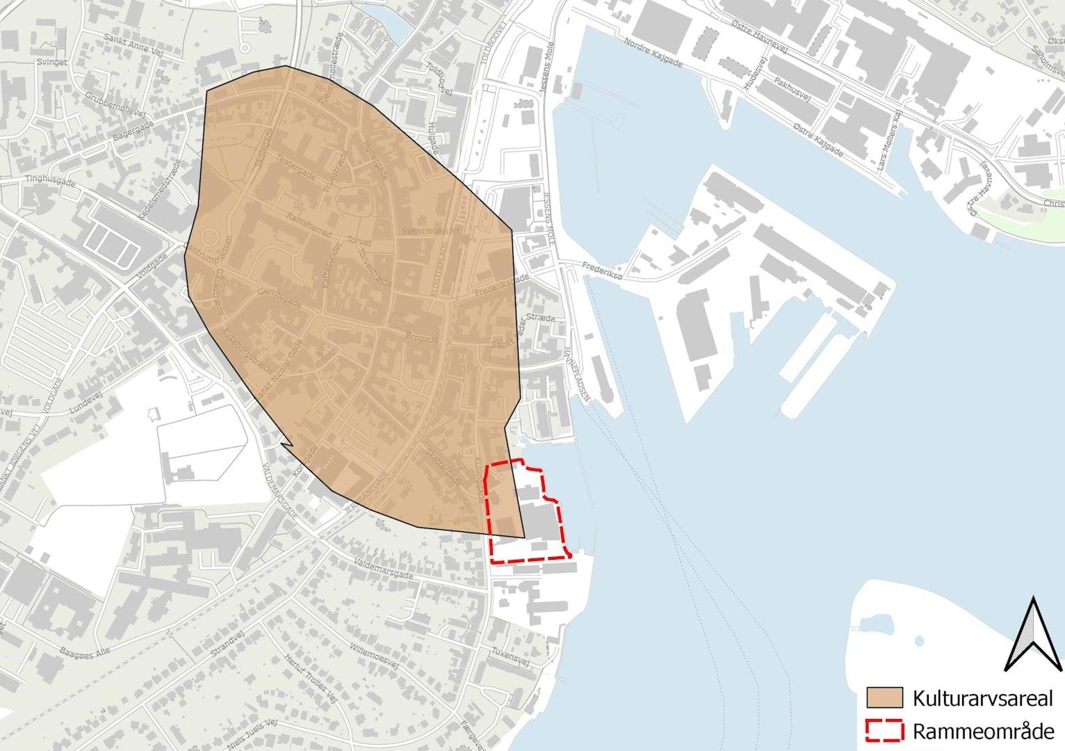 Rammeområdet er beliggende i udkanten af et kulturarvsareal udpeget af Svendborg Museum med national betydning. Kulturarvsarealet indeholder middelalderbyen Svendborg, hvor byen var befæstet med volde og grave. Det fremgår under stedets lokalitetsnummer 090513-166, at der intet er tilbage af de befæstede anlæg. Indenfor Svendborg middelalderlige vold og voldgrav er der gennem de seneste 30 år gennemført en række udgravninger, hvor flere har været med til at kaste nyt lys over dagliglivet i middelalderbyerne generelt. Middelalderens kulturlag er mellem 3 og 5 meter tykt med ekstremt gode bevaringsforhold på grund af høj grundvandsstand. I kulturlaget findes velbevarede bygningslevn etc. Kulturlag i Svendborg middelalderlige bykerne indenfor fortifikationen varierer mellem 3 og 5 meter i tykkelse. Bevaringsforholdene er særdeles gode.