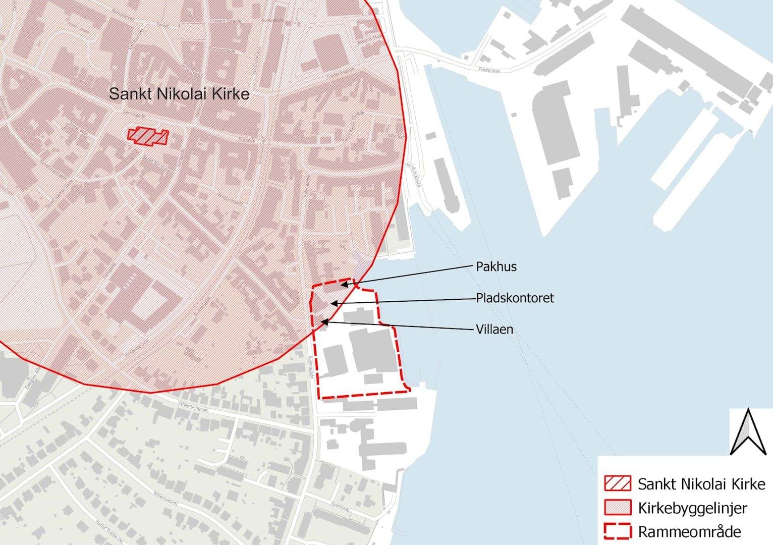 Indenfor kirkebyggelinjen findes det ene pakhus, pladskontoret samt villaen, som via fredninger ikke giver mulighed for ændringer af det eksisterende byggeri.